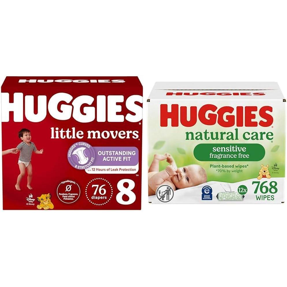 “Huggies Little Movers Baby Diapers are designed to stay in place through active play! These disposable baby diapers are designed for worry-free running, jumping and playing without any leaks or disruptions. Each Little Movers diaper is up to 100% leak-free (even for blowouts!) and offers up to 12 hours of comfortable protection to keep your baby active and clean. Our diapers feature a curved and stretchy fit and a flexible, yet secure waistband designed to prevent leaks and help keep your baby comfortable while on the move. Double Grip Strips provide a secure, flexible fit and the diaper is designed to help eliminate gaps at the legs and waist to protect against leaks and irritation. These Huggies diapers are extra soft and contoured around the legs to help provide red-mark free, gentle protection. Little Movers are made with a fast-absorbing Dry Touch Liner and our baby diaper locks away 99% of wetness to help keep skin dry. Plus, a wetness indicator easily lets you know when your baby is ready for a diaper change. Little Movers Diapers are available in size 3 (16-28 lbs), size 4 (22-37 lbs), size 5 (27+ lbs), size 6 (35+ lbs), size 7 (41+ lbs) and size 8 (46+ lbs) Huggies Natural Care Sensitive Baby Wipes are designed to help keep baby’s skin clean and healthy. Plant-based*(*70%+ by weight plant-based materials) and made with no harsh ingredients, Huggies Natural Care fragrance free wipes are hypoallergenic and dermatologist-tested and the pH-balanced wipe helps maintain healthy skin for your baby. They're recognized by the National Eczema Association and they're safe for sensitive skin and free of fragrance, alcohol, parabens and phenoxyethanol. With the #1 branded wipe**, you can feel confident you are giving baby a safe, gentle clean. Huggies Natural Care unscented baby wipes, with Aloe and Vitamin E, provide a gentle clean for baby’s skin. “