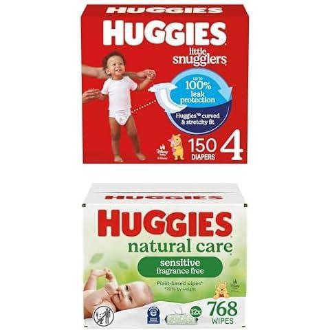 Bundle of Huggies Little Snugglers Baby Diapers, Size 2 (12-18 lbs), 186 Count + Huggies Natural Care Sensitive Baby Wipes, Unscented, Hypoallergenic, 99% Purified Water, 12 Flip-Top Packs (768 Wipes)(Size 4)