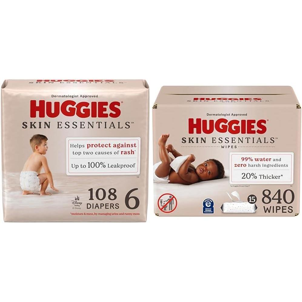 Bundle of Huggies Skin Essentials Baby Diapers, Size Newborn (6-9 lbs), 180 Count + Huggies Skin Essentials Baby Wipes, Hypoallergenic, 99% Water, 15 Flip Top Packs (840 Wipes)(Size 6)