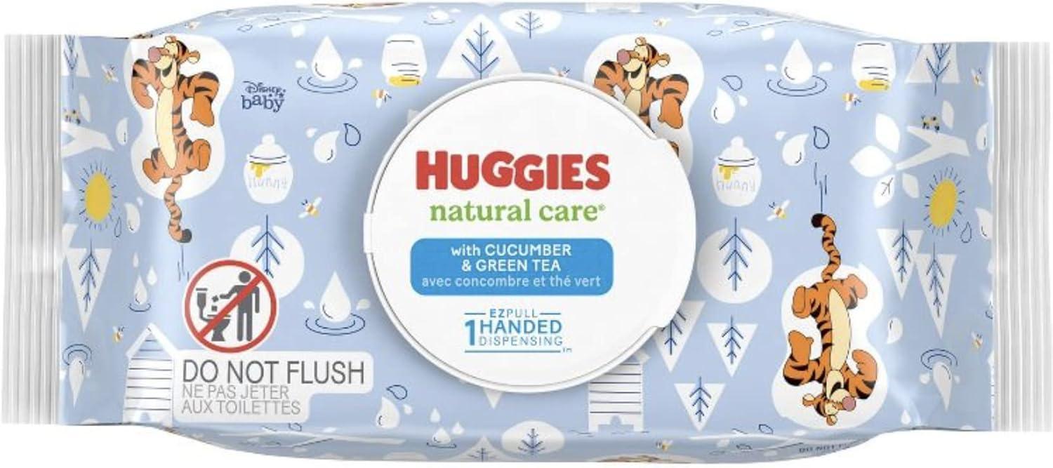 Huggies Natural Care Cucumber, Aloe and Vitamin E Baby Wipes are plant-based wipes* that are made to be gentler on sensitive skin.** Dermatologist-tested and hypoallergenic, Cucumber, Aloe and Vitamin E baby wipes contain no harsh ingredients . These baby wipes with cucumber, aloe and vitamin E have a light and refreshing scent. These disposable baby wipes come in packaging with cute Disney patterns for a delightful touch that will fit in great on your changing table, in your diaper bag and wherever you need a wipe! Additionally, the flip-top design and 1-Handed Dispensing makes it easy for you grab wipes with a single hand! (*70%+ by weight plant-based materials)(**vs Huggies Simply Clean)